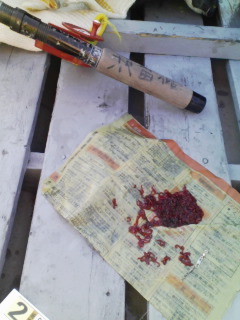 釣り糸に5箇所くらい針がついており、赤虫がえさです。赤虫むにゅむにゅと気持ち悪る、釣り針小さいからえさつけがめんどくさっ。寒いな~。道具としては、ピンセットがほしかった。そんな不満事を少々思ったけど、行く前にそんな文句はひとことも口に出さず、今日はわかさぎ収穫しなくっちゃ。