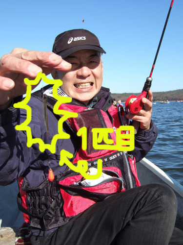 くやしいから、ちょっとふて寝して気をとりなおし再度挑戦。だけどもあたりはなし。もうわかさぎなんてもういないんじゃないのか、「はぁ~」とため息をつく。場所を変えてみようとM1号さんが竿をボートに引き上げたら、あら~1匹。偶然にも引っかかっていました。いやーよくやった。でかしたM1号さん!