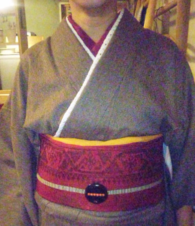 この日は、能楽堂ということもあり着物で参上してみた私です。パンクといえど、場所が能楽堂だし、正絹はやめてヘリンボーン柄の洋服生地っぽいもので、レースを襟に少しあしらい、赤のつけ襟に赤い帯で。せっかくなんだもの楽しまナイトじゃナイトじゃ~!