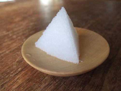 荒塩を少しお水で湿らせて、この固め器にぎゅうぎゅうに詰めます。そしてお皿に出すとこんなきれいな盛り塩ができあがります。