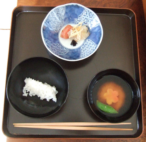 ごはん、味噌汁、向付け(鯛昆布〆・明太子)