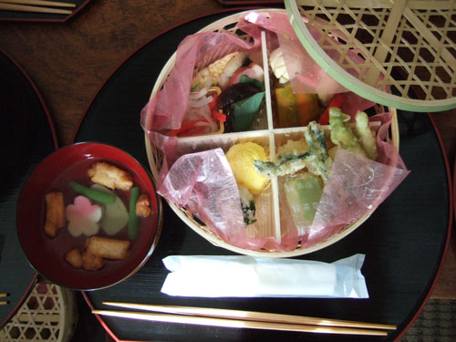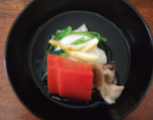 今回二日間食事の準備はしんどいので美濃吉さんのお弁当で、それにあげもちのお吸い物はこちらで準備、軽いお雑煮のようで美味しかったです。