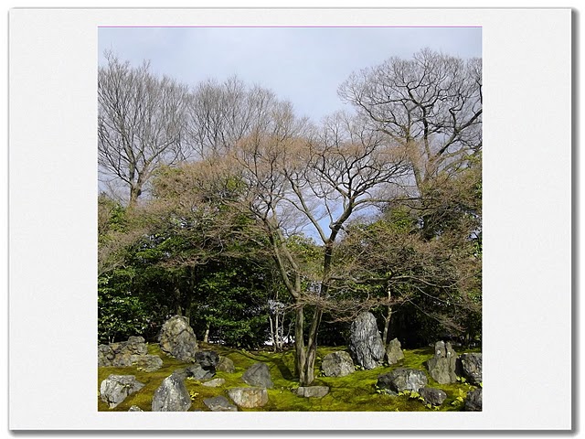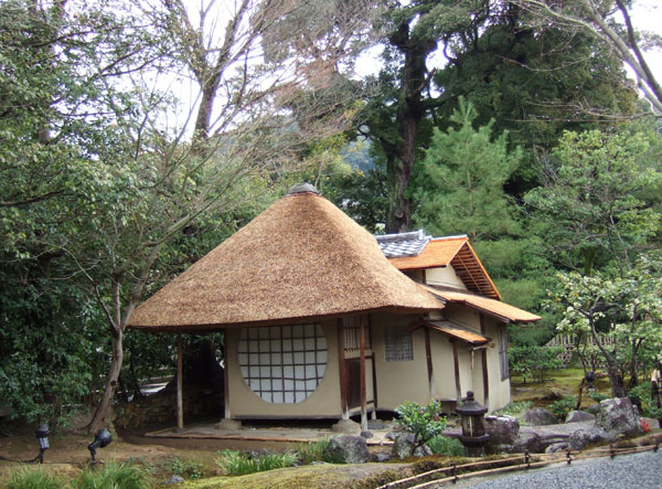 高台寺の中には、もうひとつ遺芳庵(いほうあん)というお茶室もありました。田舎つくりの大きな丸窓がなんとも奇妙なデザインの茶室