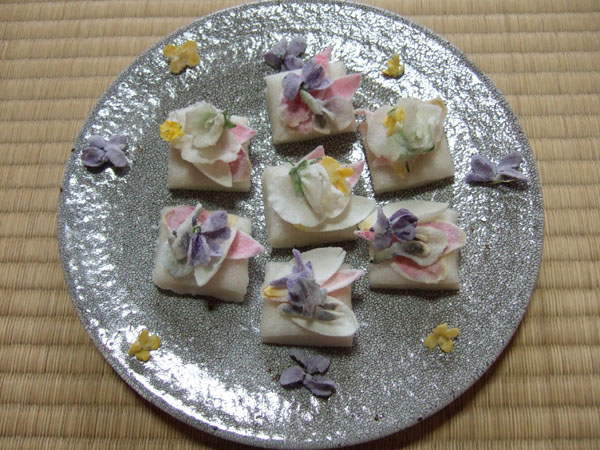 W婦人がこの日、お手製のお花饅頭ケーキをつくってくださいました。スミレに大根の花、原種チューリップ、インゲンの花つみ、