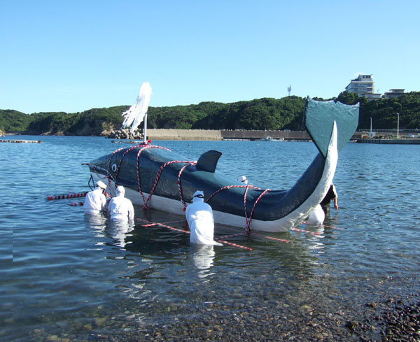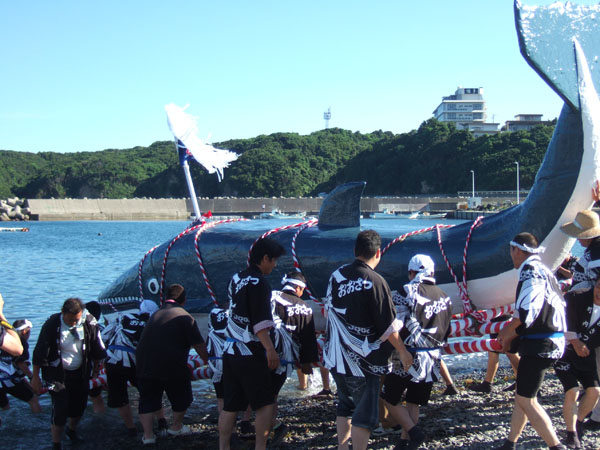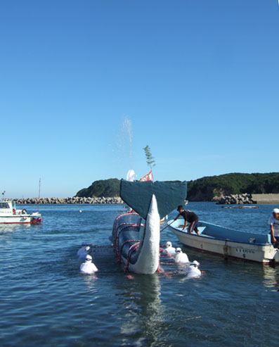 海に浮かんだ鯨みこしは潮を吹きながら(素晴らしい、なんと!鯨らしい)海女さんに送られ、漁師の船に引かれ海を回船します。