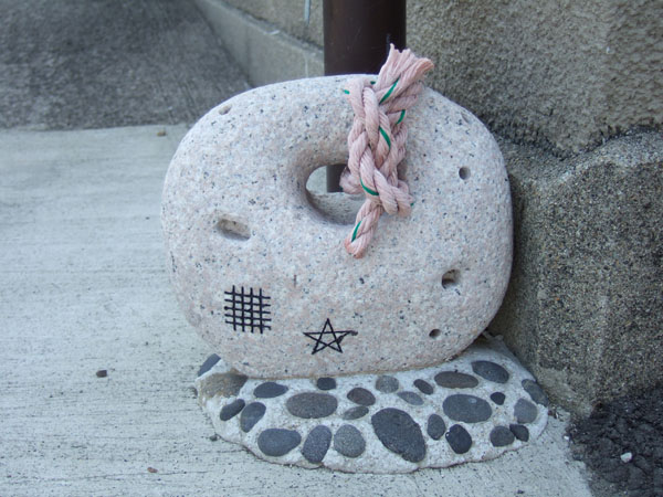 ドーマン セーマンのマークがついた「石いかり」 。盗難防止のために地にしっかり固定されています。