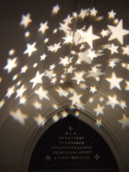 大谷石の幾何学的な装飾が、ライトアップされ、なんだかとてもエキゾチックに見えます。