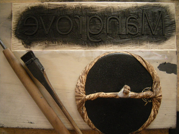 このホームページの文字も、M1号の名刺のマングローブの英文も実は版画で彫ってあります。