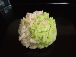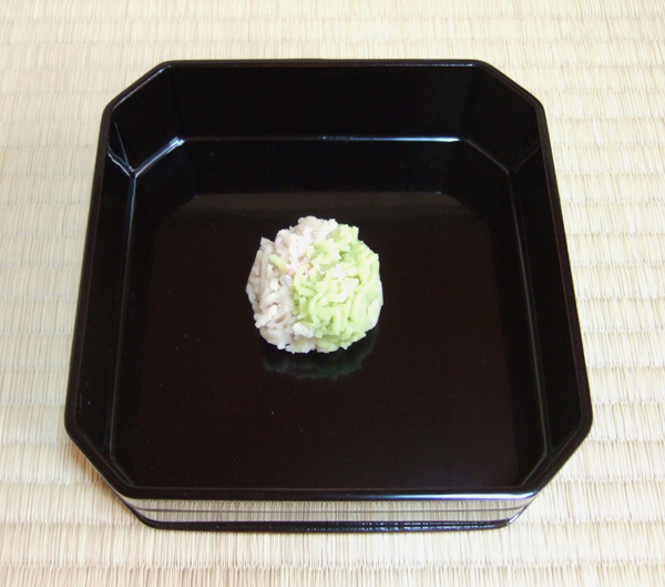 そして席入り。まず簡単なお弁当とお吸い物をお出しして、主菓子も食べて頂きました。