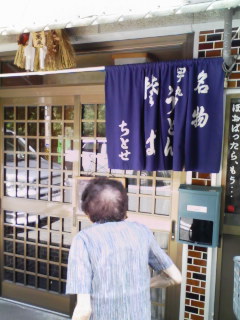 宇治山田駅のそばの「ちとせ」にもときどき伊勢うどんを食べに行きます。ここのお店は、なぜかいつものれんが写真のように偏ってます。(なんかさー気になるのね)