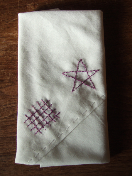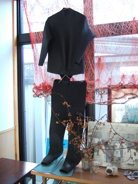 M2号は、海女がお守りとして使っているドーマン・セーマンのマークを手拭いにちくちくやっています。