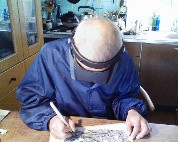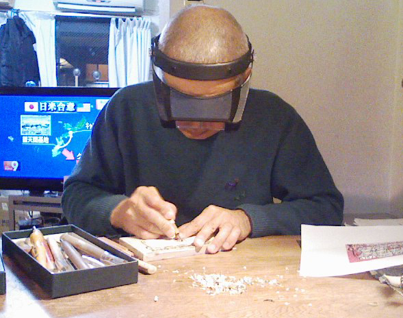 夕食後も朝食後も拡大めがねして彫ってます。朝日の光源が彫り跡見るには貴重な時間なのだそうだ。