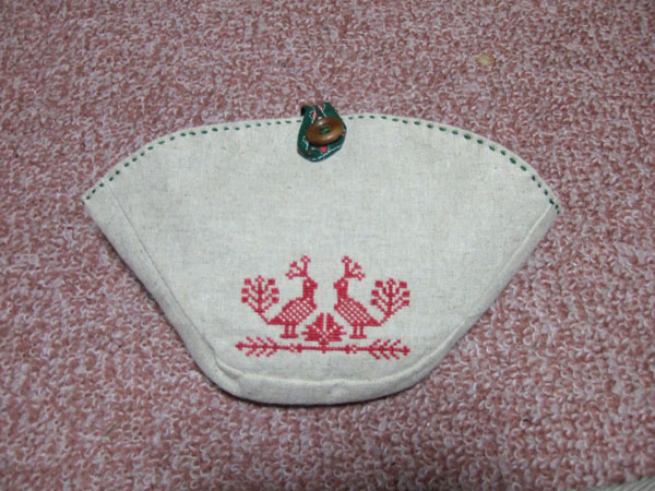珈琲のペーパーフィルターを入れるものみたいです。とても手の込んだピーコックの刺繍がしてありました。もうひとつはスワン。