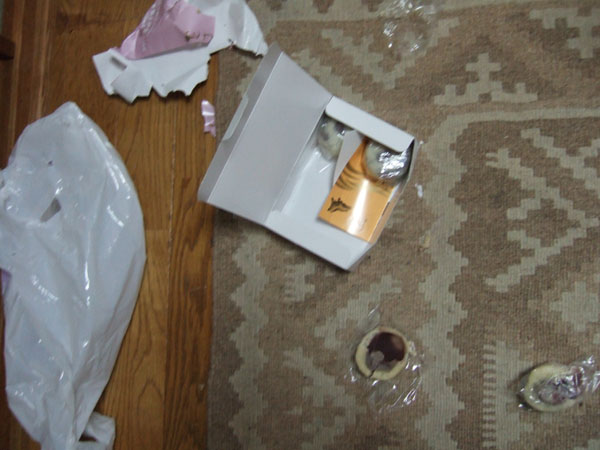 前夜、新年会で呑み歩き、饅頭の管理を怠ったのは私たちの責任ですが。包装紙もビリビリに破いてあり、ひどく汚い食べ方・・・あんこだけなめ、無残に食い散らかしてありました。