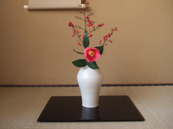 南天と椿、鶴田母が生けてくれました。これは初釜から1週間たったときのもの。