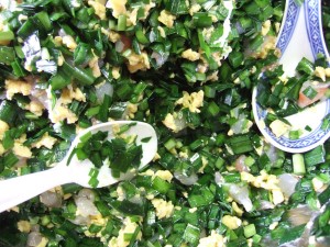水餃子は皮つくりから。豚肉ミンチタネと海老ニラいりたまごの二種類のタネで包みます。