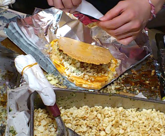たこせんべいに焼いた卵をのせ、天カスとお好みソースとマヨネーズをかけ2分割してできあがり!