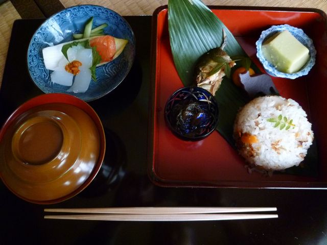 この時期、垂井では朝捕り筍が出まわります。筍ごはん、鮎一夜干し、鳥羽のもずくやわかめなど使って間に合わせでつくりました。