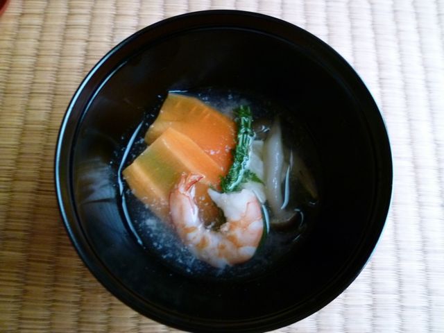 煮物椀 残念ながら冷めていたとのこと。にんじんの切り方ももう少し勘考したいですなぁ。盛り付けは肝心です。