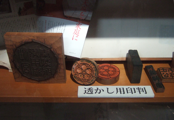 透き和紙を作る透かし用印判なども展示してありました。この透かし紙をつくることがこの会社本来の技術なのだそうだ。 版画原稿を伊勢型紙で型紙をつくり、その型紙をスク道具にそれを貼り付けて紙をすくと表面に凸凹ができるので それが透いた模様に仕上がるのだそうだ。伊勢型紙ってのは型染めの型だけでなく、そういうものにも活用していたのですね。 透き模様のついた和紙は昔から憧れの紙でしたので、見ているだけでワクワクしました。 マングローブ部員(M2)だけが?コレにとても興味津々なのでありました。 いいね~和紙って。面白そうやね~。版木はあるし、なにか作れたらいいのになぁ・・・?