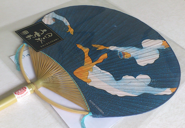 海女を銅版画で描く吉田賢治さんの作品を伊勢和紙に出力して、それを四日市の稲森製の日永団扇で制作してもらいました。
