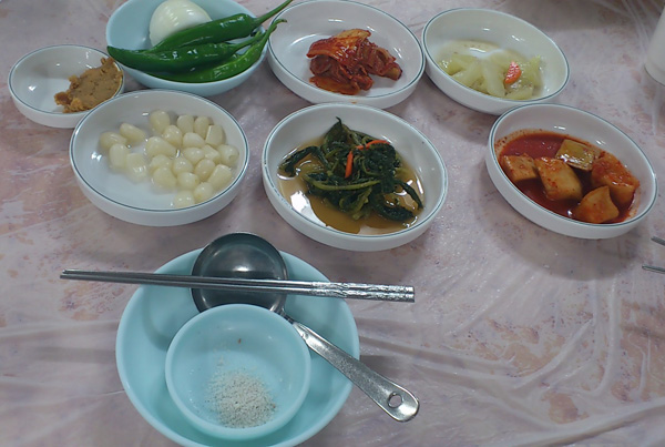 毎日キムチ。当たり前にキムチ。そしてキムチも2~3種類でてきます。青唐辛子やたまねぎは甘辛の味噌につけてかじって食べます。