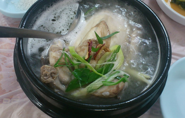 韓国の代表的なスープ料理の一つです。鶏肉の内臓を出し、そこにもち米、なつめ、栗、松のみ、高麗人参、にんくなどのを薬膳の食材を腹に詰めて、2~3時間煮込んでつくる暖かいスープ料理のことです。
