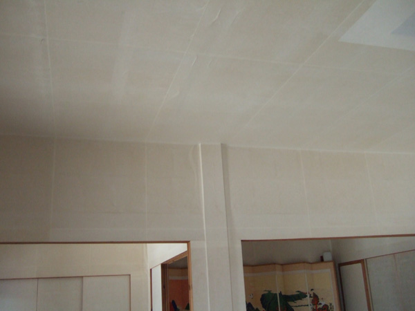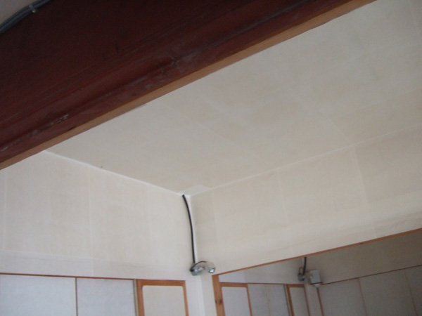 貼っていく時のつなぎ目は1センチほど重ねて貼っていきます。天井も壁も貼っていくのがおもしろい。