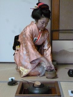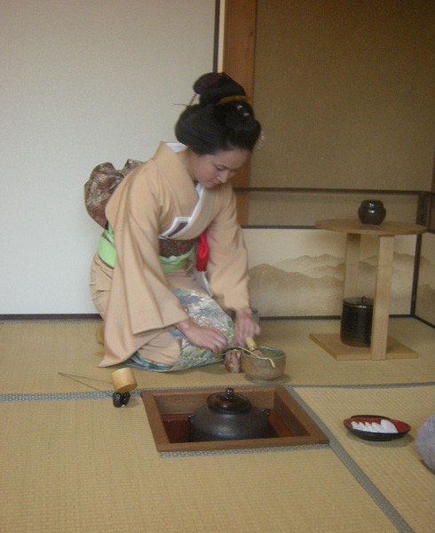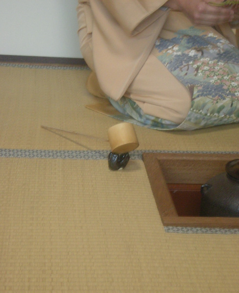 そしてお客さまに一度中立ちしてもらいます。炉の炭の火を少し直して。亭主カイユさんの濃茶点前です。