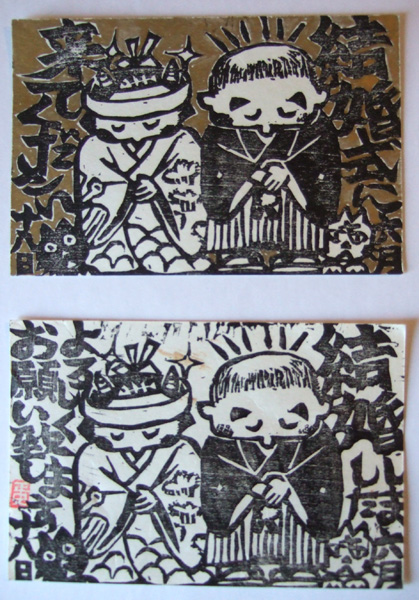 上のは、私たちの結婚式の招待状のために彫ったハガキサイズの版画です。