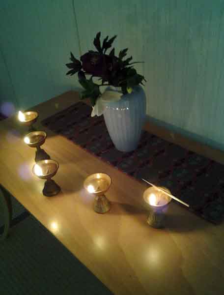 四時半に席入り。鶴田父の絵にクリスマスローズの花が可憐でそのまわりに小さな灯明が素敵なのでした。この小さな真鍮の器はチベットのものだそうです。この杜鵑草庵らしい”しつらい”がとても嬉しく感じました。