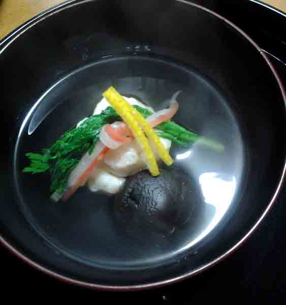 煮物椀   海老しんじょう 椎茸 小松菜 松葉ゆず 紅白結び