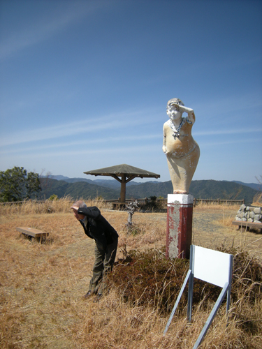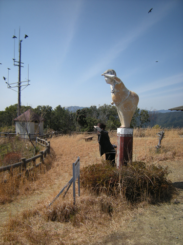 展望台には、こんな愛嬌ある人も立っていて、われわれもまねっこしてみた。そしてやたらにカラスも多かったのは、なぜなんだろうか!?