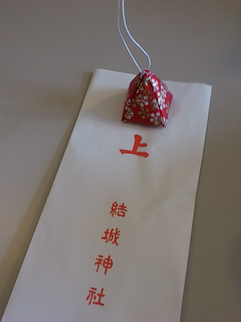 この包んである千代紙がおみくじになっていて、中に小さな梅の鈴が入っていました。