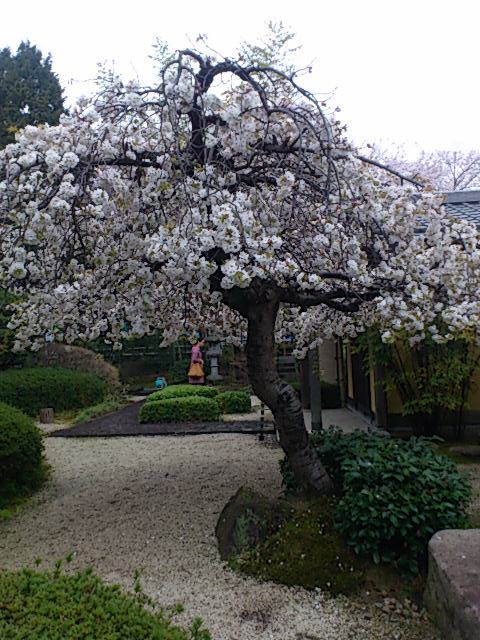 桜の傘みたいでしょ。朝の雨で、お庭の苔もしっとりと浄化されたように美しい。