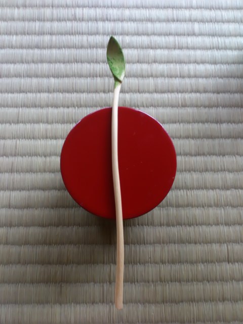 この日、カイユさんの旦那さん輝さんが削ったという茶杓 「芽吹き」と甲朱棗の取り合わせがなんとも素敵で心に残りました。