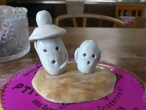 サザエも粘土で作って彩色してあります。こんなサザエや犬を作る子に成長していた。どえらい(ものすごい)成長ぶりやね。