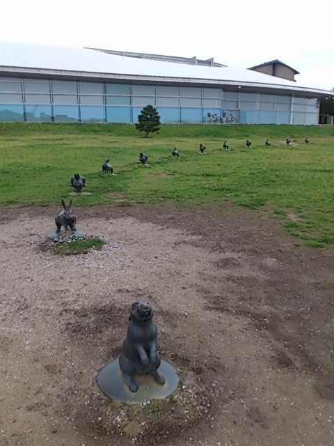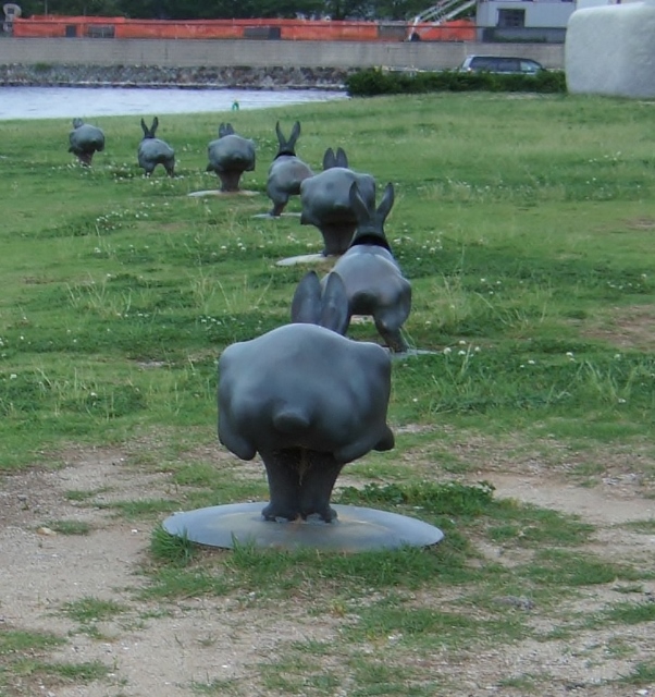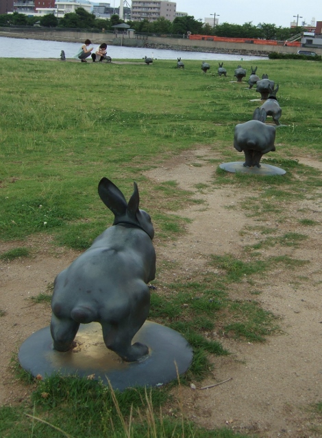 休みだということを私(M2号)のせいにされ、ため息つきながら美術館辺りの宍道湖をうろついていたら12羽のうさぎのブロンズを発見。近づいて見てみるとまたもやここでも薮内佐斗司さんの作品を見る。