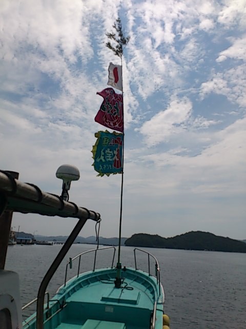迫間浦漁港から朝九時に神輿がでるのですが、朝からいろいろとアクシデントがあって、迫間浦へ到着が遅れ神輿を見るのは間に合わず。しかし式典には間に合うだということで、漁港から大下水産さんの大宝丸船に乗せてもらい丸島へ向かいました。