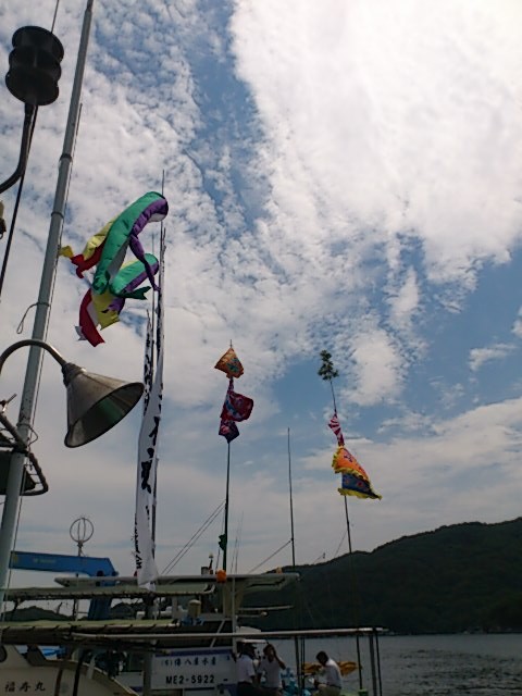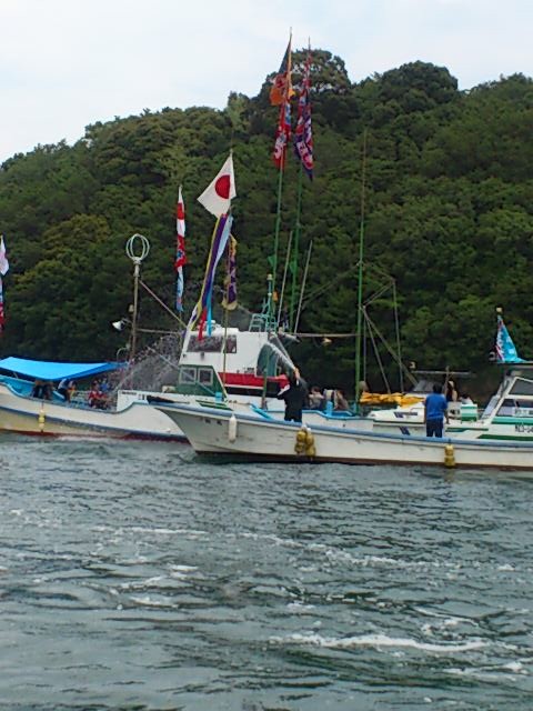その後そうめんのおふるまいも受けて、その後は海上パレードに参加。いくつか神様を祀ってあるポイントがあるので、宮司さんをのせた船がそこをまわっていきます。