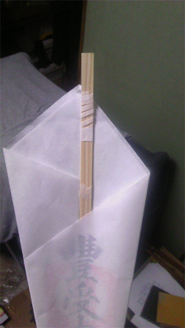初詣で買った剣先札を雑に紙袋に入れていたため中の木の札が折れていました。