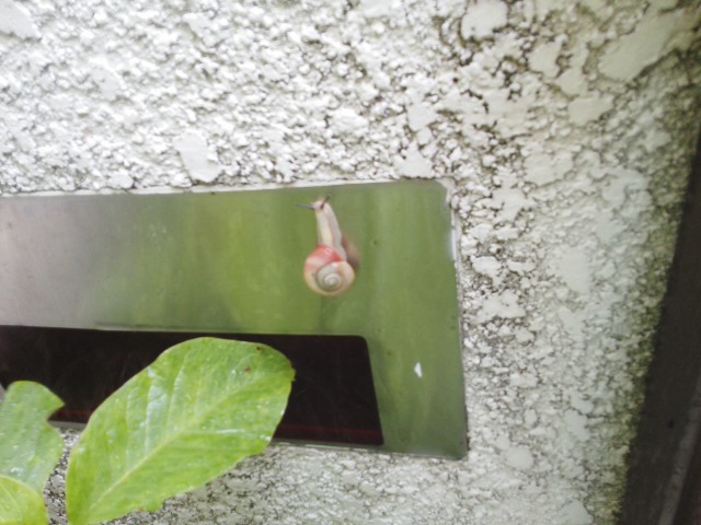 伊勢の家に郵便物を取りに行くと、郵便受けにかたつむりがいました。(ピンボケですが)