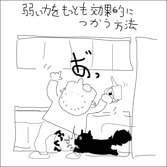 M3号は、私が朝お湯を沸かしたりしていると“餌よこせ!”コールを続けます。それでも無視していると突進してきて、膝の後ろ側にぶつかり、いわゆる“ヒザカックン”を無意識のうちにやります。