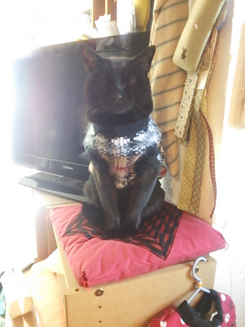 ペットに服を着せてかわいがるのは好きではありませんでしたが、冬になるとM4号があまりに寒そうなのでM2号がセーターを買ってきました。バーバリー風のセーターで“ええとこの子”みたいに見えます。下に見えるちゃんちゃんこを着ると急に動きが鈍くなり気の毒な気がしましたが、セーターは大丈夫でした。首の周りは自分でやったのかモヘアのセーターみたいに毛羽立っています。きっとM3号のようになりたくて自分で加工したのでしょう。まめなやつ。