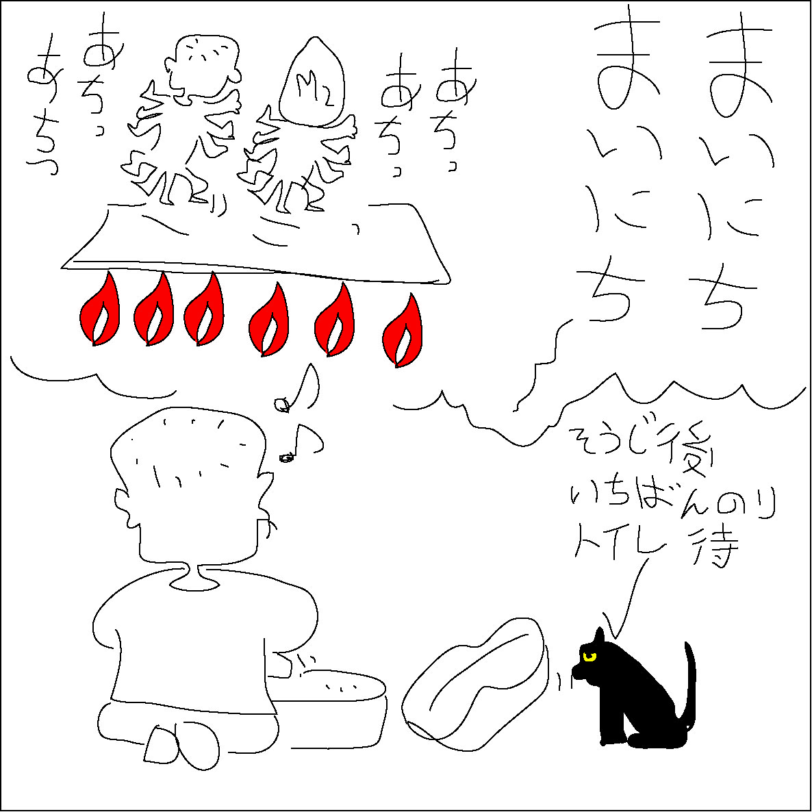 最近多いのは、毎日毎日やらねばならない猫のトイレの掃除とか、仕事が忙しくて一息もつけないとき“泳げたい焼き君”の・・・“毎日毎日~僕らは鉄板の上で焼かれて嫌になっちゃうよーー”という部分だけを延々と繰り返します。