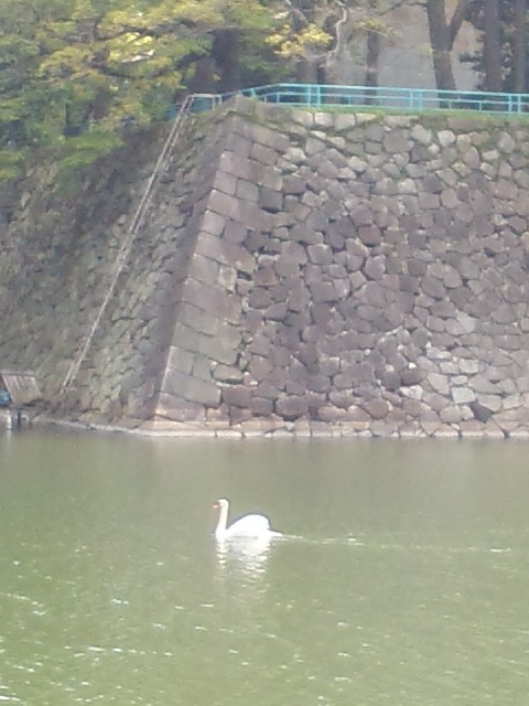 お堀には冬は渡り鳥の水鳥がいましたが、今日は白鳥でした。一匹だけでわがもの顔でお堀を泳いでいました。
