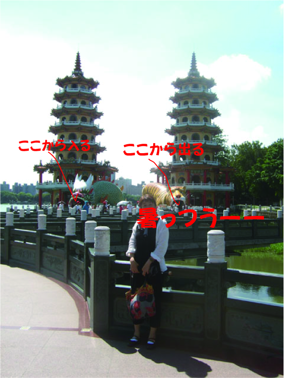 まあ楽しげな場所でした。龍から入って虎から出てくると厄払いになるそうです。でも8階建てくらいの塔を2本、上ったり降りたりしないといけないので結構大変です。でものんきな感じの虎と龍が気分を穏やかにしてくれました。それにしても暑かった。