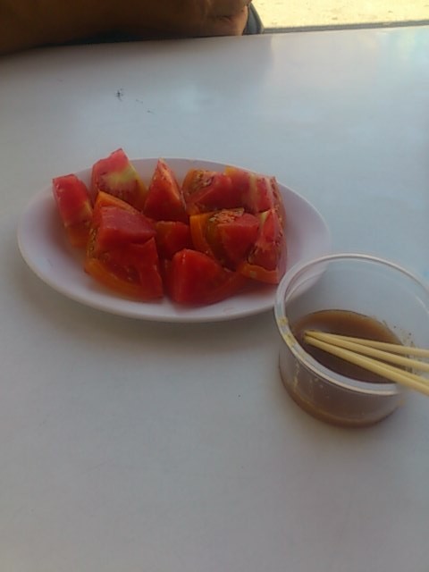 この賑わいがとにかく楽しいです。 帰りにここの売りだというトマトを食べてみました。甘いたれみたいのがついてきました。食べるとうーん・・・?