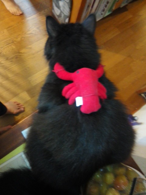 M2号は、M3号にロブスターのぬいぐるみを背負わせて喜んでいます。