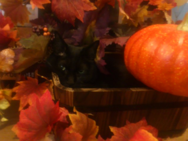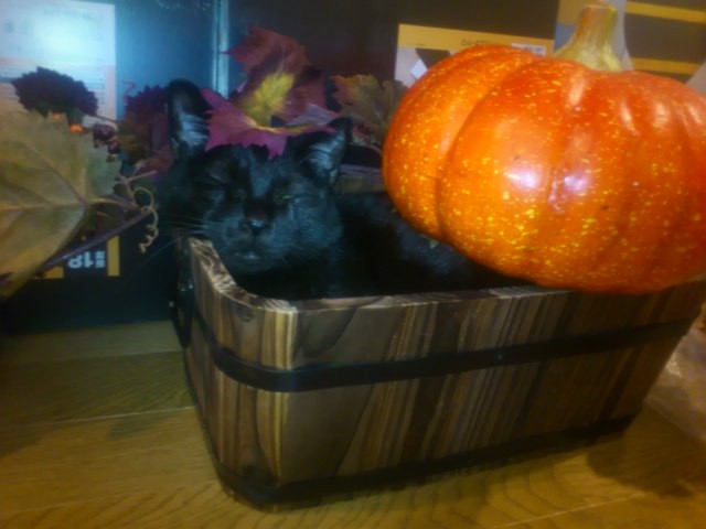 ハローウィンの準備をしているころM4号がいつの間にかディスプレイ小物の中にうずまってご満悦の写真です。